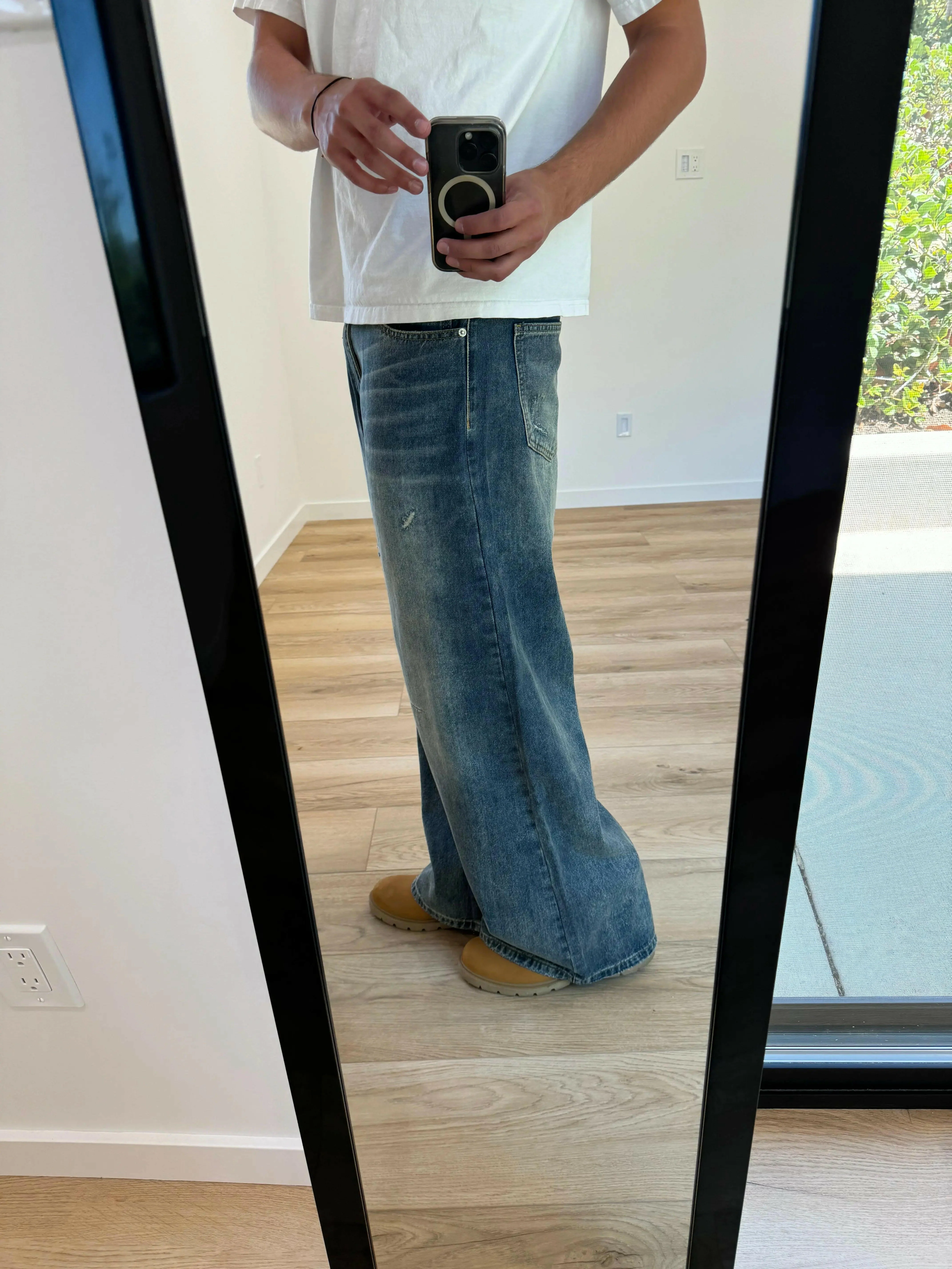 Moreover, the fit of these jeans stands out because of their baggy style, which provides the ultimate comfort without looking sloppy. The slight distress adds a touch of edginess to the outfit, making them suitable for both casual outings and semi-formal occasions. The fabric is soft yet sturdy, ensuring that these jeans will be a long-lasting staple in your closet. You can wear them with a simple T-shirt for a laid-back look or dress them up with a stylish jacket for a night out.